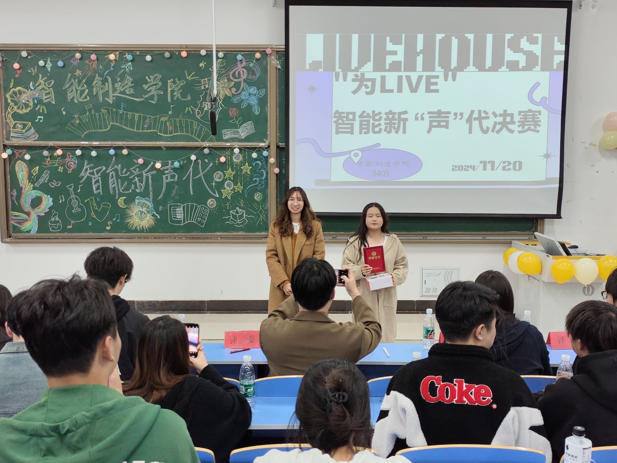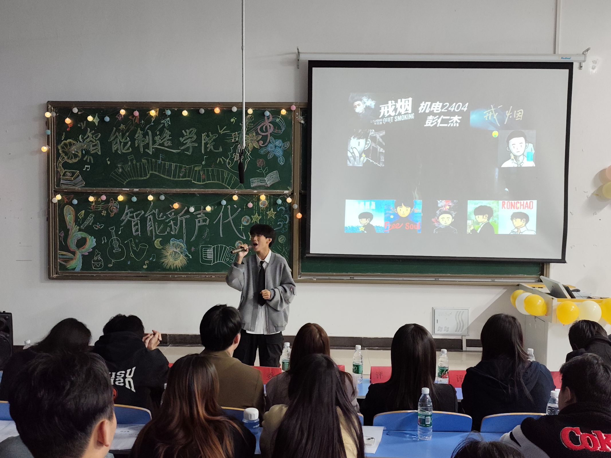 本网讯(通讯员 桂秉盛)“此曲只应天上有,人间能得几回闻。”为我院同学提供一个展示自我,交流学习的平台,促进校园文化建设,营造积极向上的校园文化氛围,11月20日晚6:30,我院在3405教室举办了智能新‘声’代歌唱比赛决赛。党总支书记王艳,党支部书记雷倩及全体辅导员作为嘉宾出席本次活动,团总支书记晏学渊,思政辅导员吴昙、柯婷,校学生会文体部部长吕庚,艺术团主席方博,教育学院学生会主席朱颖,艺术团声乐部部长豆文怡,艺术团说唱部副部长郭梦如担任本次大赛评委,智能制造学院全体学生共同参与,本次大赛由万荣鑫、张昕媛主持。