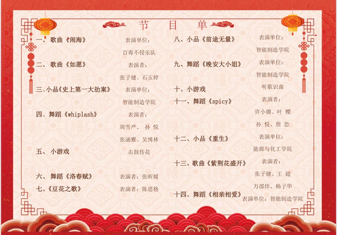 本次晚会的节目由智能制造学院与能源与化工学院团总支学生会共同选送,共计12个节目,节目涵盖歌曲、舞蹈、小品等类型。