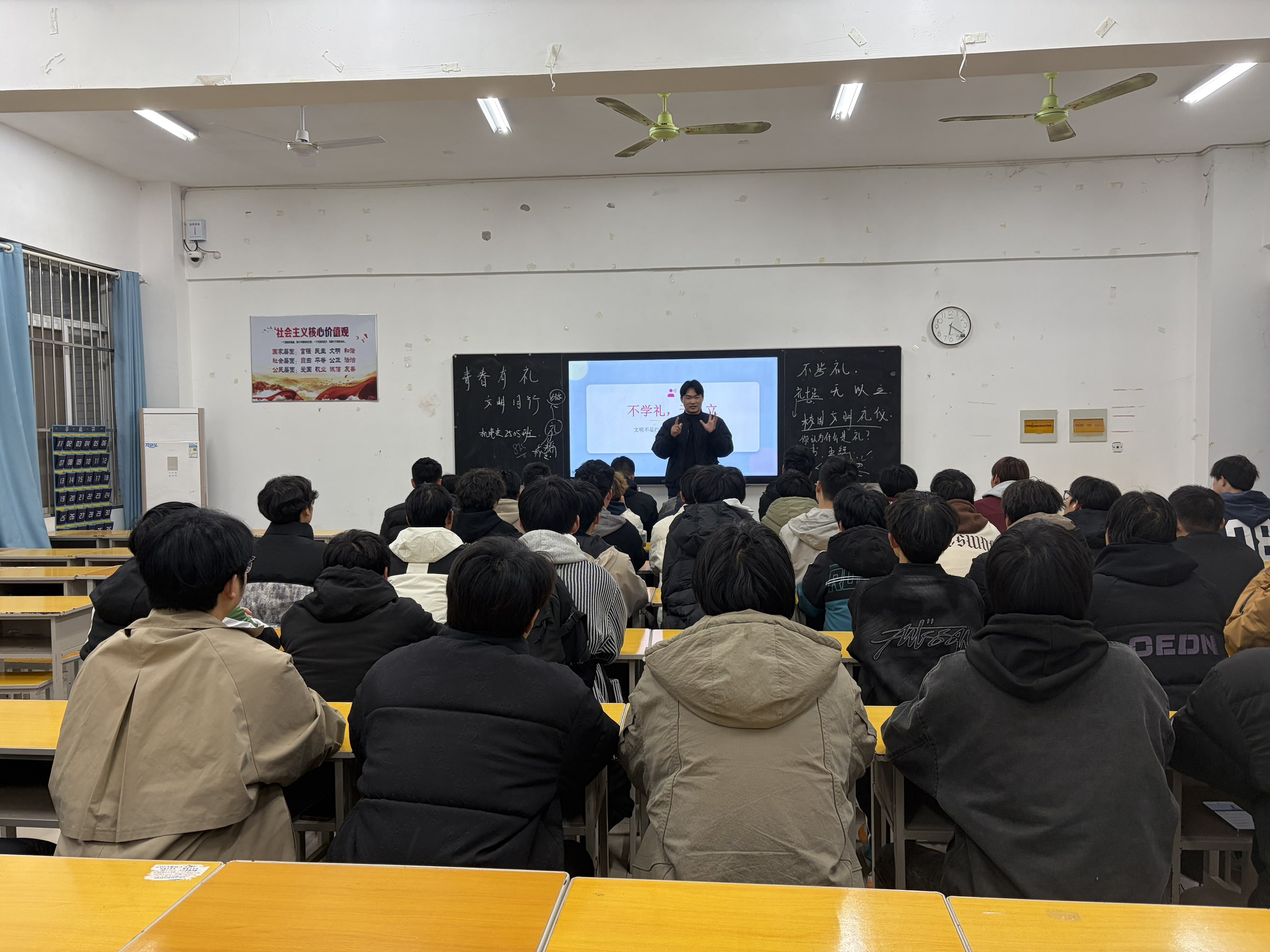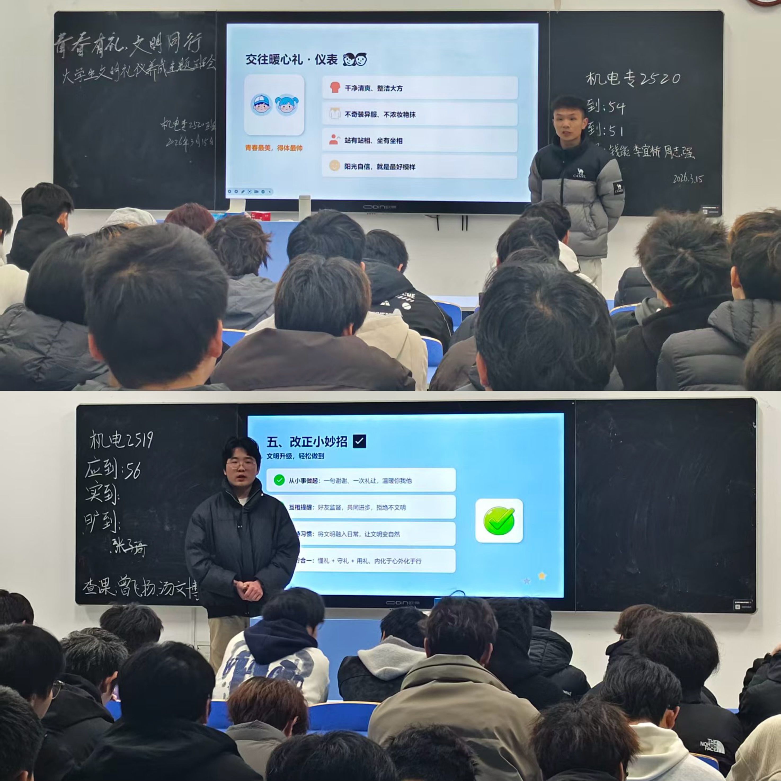 班会围绕课堂礼仪、校园文明、交往礼仪、公共文明及自我反思五个方面展开,内容贴近学生实际,既具有引导性,又富有实践意义,旨在助力学生成长为德才兼备的新时代智能制造人才。
