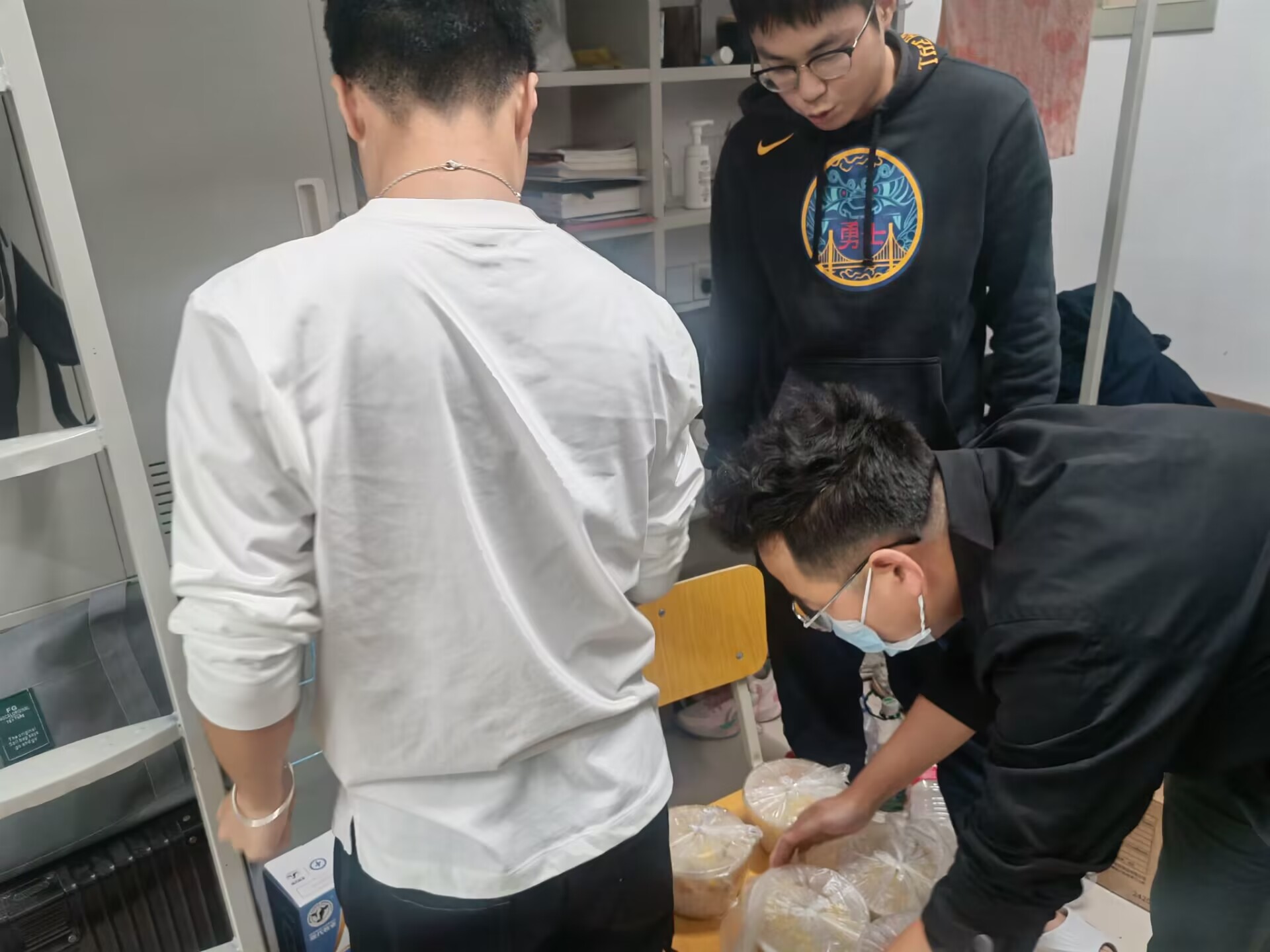 晏老师组织学生做核酸、阮老师为学生送饭