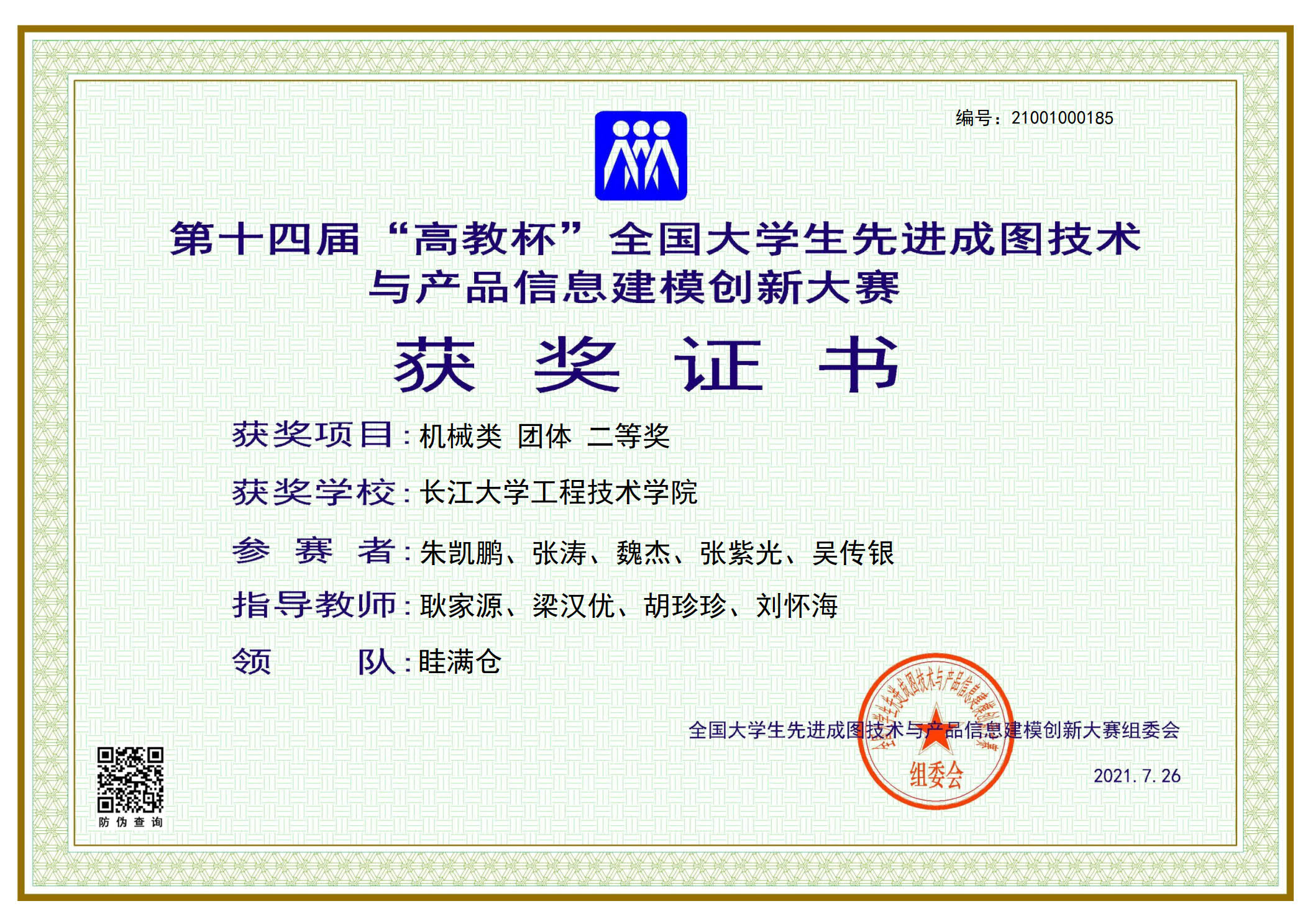 国赛方面,朱凯鹏、张涛、魏杰、张紫光、吴传银合力夺得国家级机械类团体二等奖;朱凯鹏获得国家级个人全能二等奖;张涛、魏杰、张紫光、吴传银、江涛、廖庆豪、蒋林获得国家级个人全能三等奖。省赛方面,张涛、江涛、张紫光、廖庆豪四人获得湖北省个人全能一等奖;朱凯鹏、魏杰、朱磊、蒋林、吴传银获得省级个人全能二等奖;简松、茹可龙、唐咏泉、汪自强、龙俊获得省级个人全能三等奖。耿家源、梁汉优、胡珍珍、刘怀海四位老师获得国家级“优秀指导教师”二等奖。