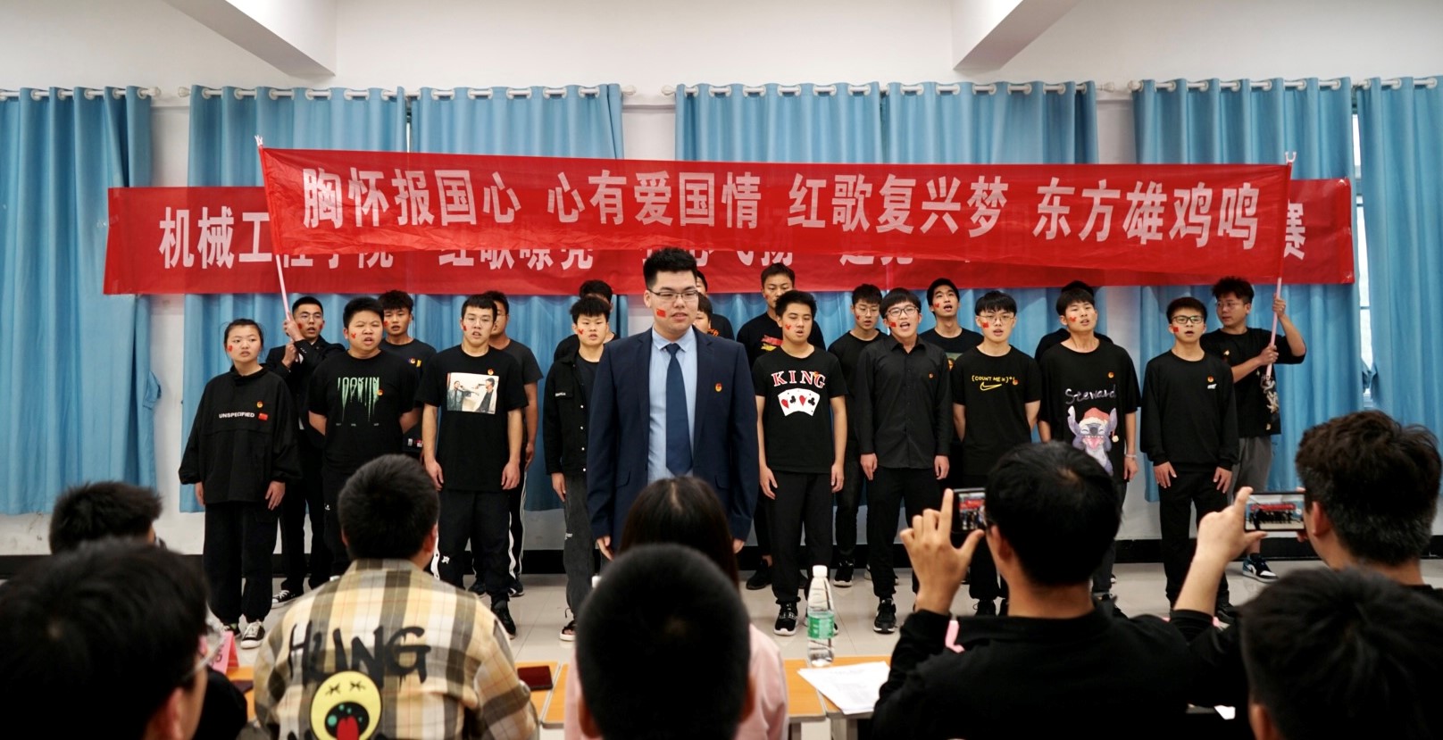 同学们胸戴团徽,纵情高歌,以饱满的热情和昂扬的精神面貌,用嘹亮的歌声,表达作为当代大学生对党和祖国真挚的爱和崇高的敬意。经过评委裁定,最终机械62003班、机械61905班、机械62004班分别获得团体一、二、三等奖。苏杭书记做总结发言,首先,苏老师对大家积极参与本次活动表示感谢;其次,对各团支部在组织、歌唱、团队合作等方面的能力予以肯定;最后,希望大家认真学习,积极工作,以饱满的热情参与学校组织的各项活动。