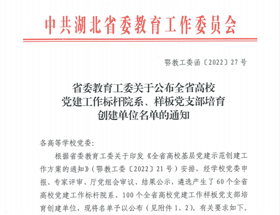 本网讯 近日,湖北省委教育工委公布了全省高校党建工作标杆院系、样板党支部培育创建单位名单,我校马克思主义学院党支部成功入选全省高校党建工作样板党支部培育创建单位。
