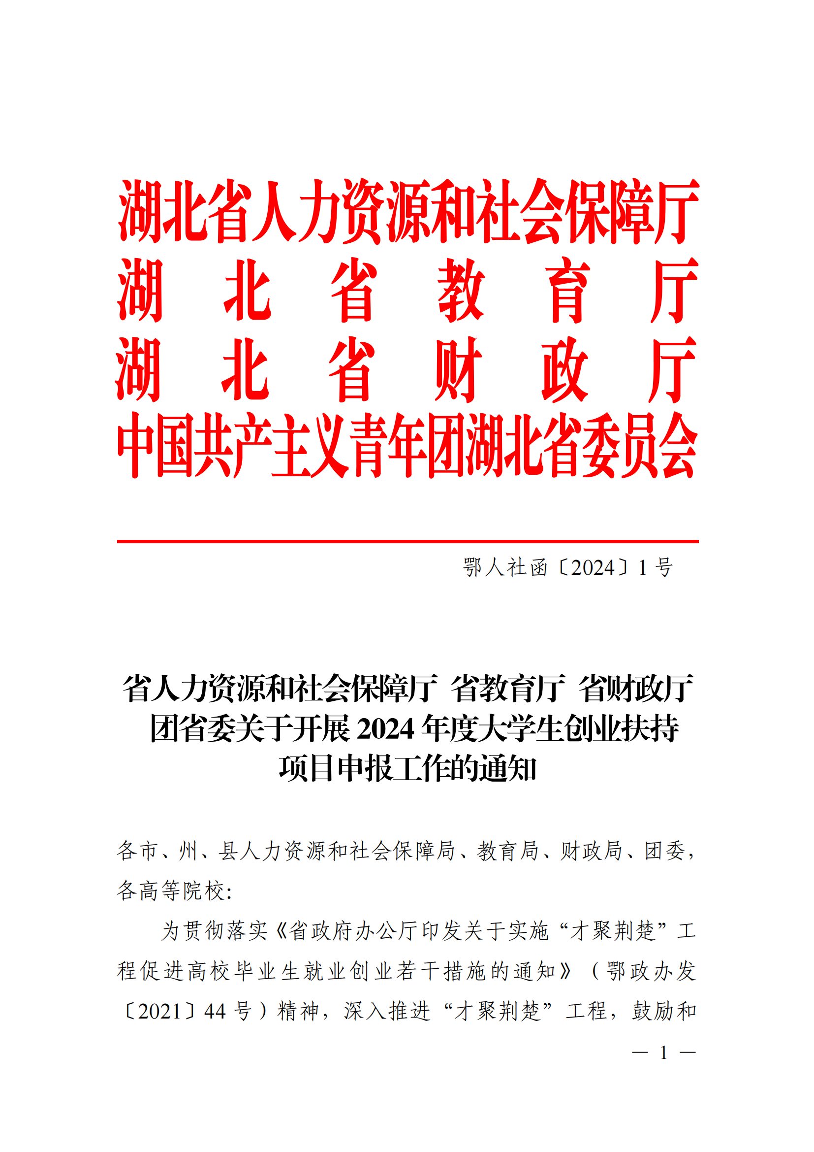 省人力资源和社会保障厅 省教育厅 省财政厅 团省委关于开展 2024 年度大学生创业扶持 项目申报工作的通知