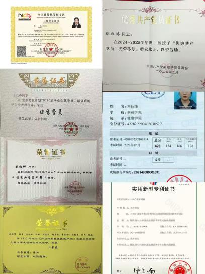 学习上:每学期专业综合测评均排名前三,获得全国普通话证书,大二上学期通过CET4考试,取得救护员证。在校期间热衷于参加各种比赛,丰富学业技能,其中包括百生讲坛——演讲比赛、“集百家之长,荟灵思之萃”知识竞赛、学习二十大,踔厉向未来”情景剧比赛、科技文化节——辩论赛、学习二十大——征文比赛、“学习二十大,踔厉向未来”演讲比赛等30余项业余比赛,获得奖项20余项;积极参与研学活动,每年都参加了血吸虫病健康教育活动,去年在太湖新闻媒体中有幸作为WilliamHill中文官方网站学生代表在太湖新闻分享她的学习收获;曾跟随专业教师参加荆州市科普大赛取得优异成绩,除此之外,还加入了2024年度及2025年度“大学生创新创业训练计划”,致力于本专业项目研究,并申请相关专利1项,项目分别为校级立项和省级立项,在2025年湖北省第十五届“挑战杯”大学生课外学术科技作品竞赛校赛中作为项目负责人带领团队获得一等奖并进入省赛。获得“国家励志奖学金”、“校级奖学金”、五四表彰“创业之星”等荣誉。