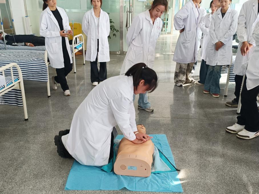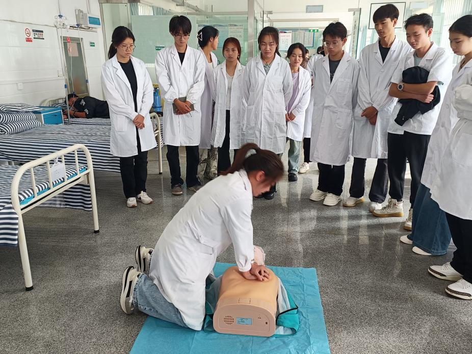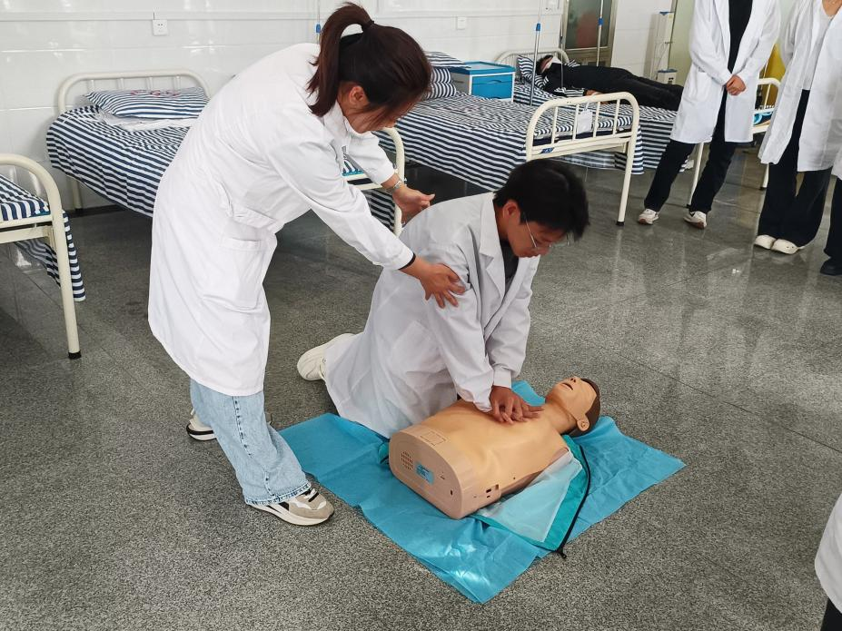 医务人员讲解演示后,同学们主动“上阵”,在专业指导下实操演练心肺复苏术。“在做心肺复苏的时候,姿势一定要准确,上身直立,双手臂伸直与地面垂直,双手指相扣……”医护人员带着专业医用教学设备,指导学生进行模拟心肺复苏的实践操作。通过这种手把手的指导方式,同学们能够更加直观地感受到心肺复苏的过程,增强了应对紧急情况的信心和能力。
