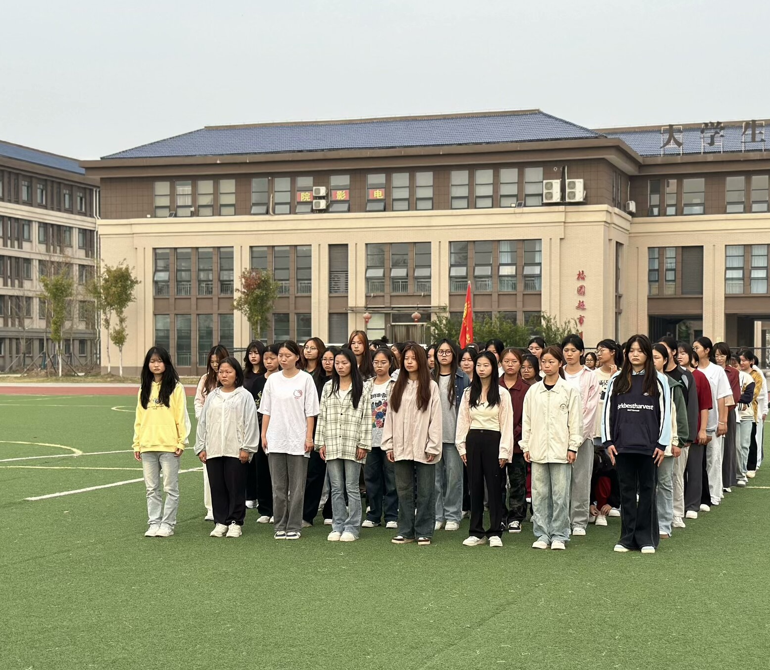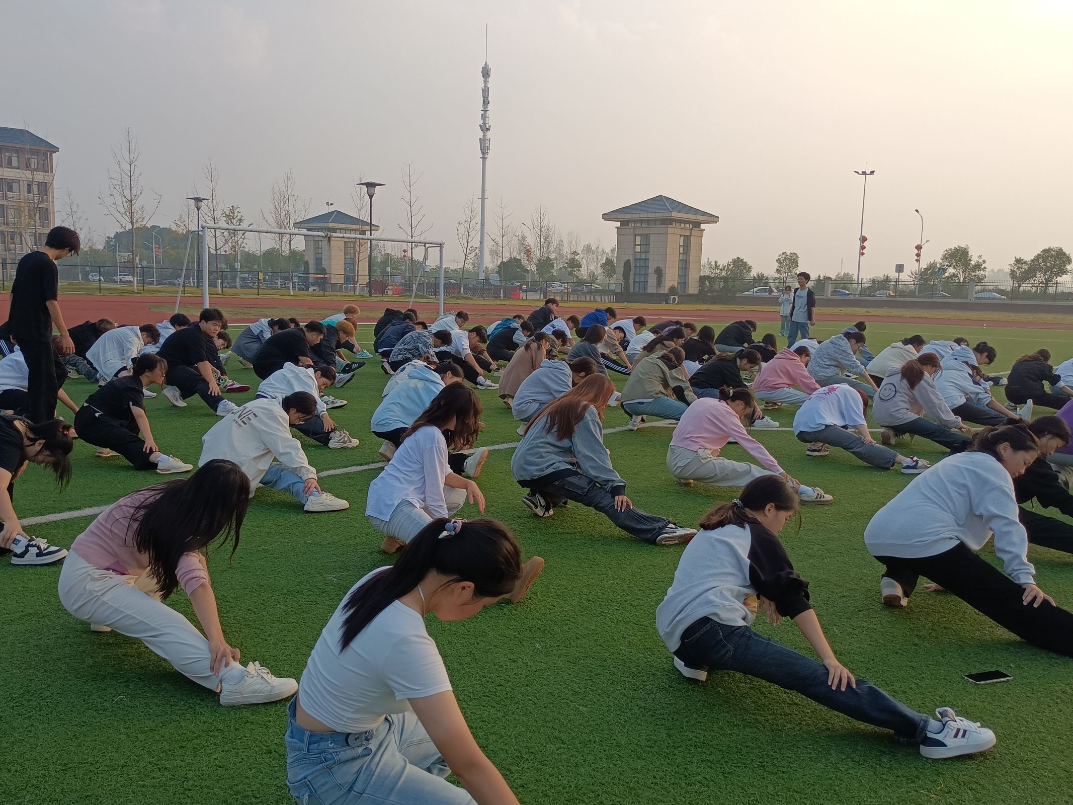 秋日的清晨,微风轻拂带来丝丝凉意,干事们提前到达操场等待点名。点名完毕后,由教官带领干事们进行了热身运动。伸伸手臂、压压腿,活动活动手腕、脚踝,一招一式,干事们都认认真真完成。整齐有序的队伍成为了操场上一道靓丽的风景线。