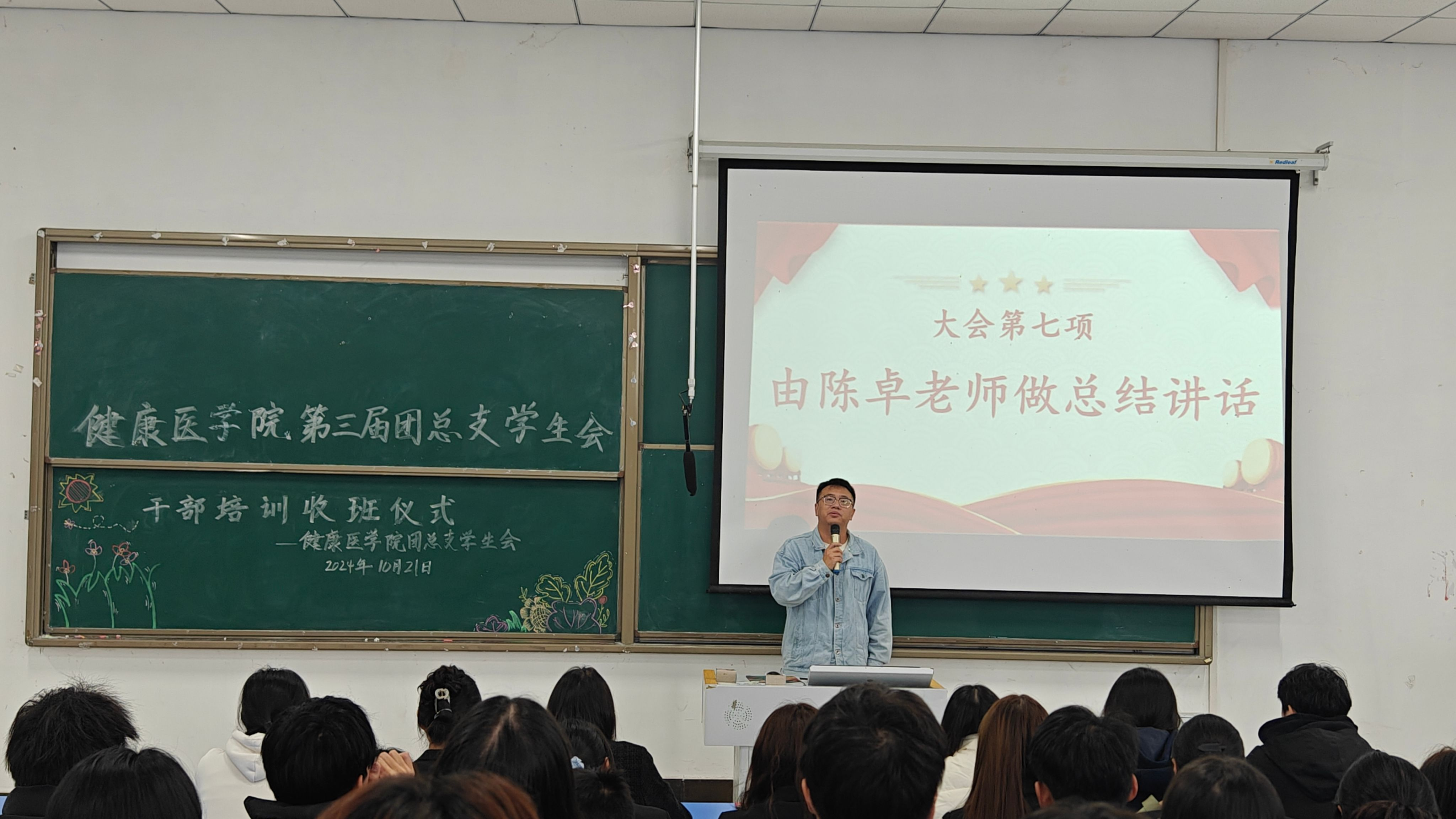 最后,陈卓老师作总结发言。他以温暖的言辞,鼓励每一位干事在未来的工作中发光发热,实现自我价值,为健康医学院第三届团总支学生会添砖加瓦。