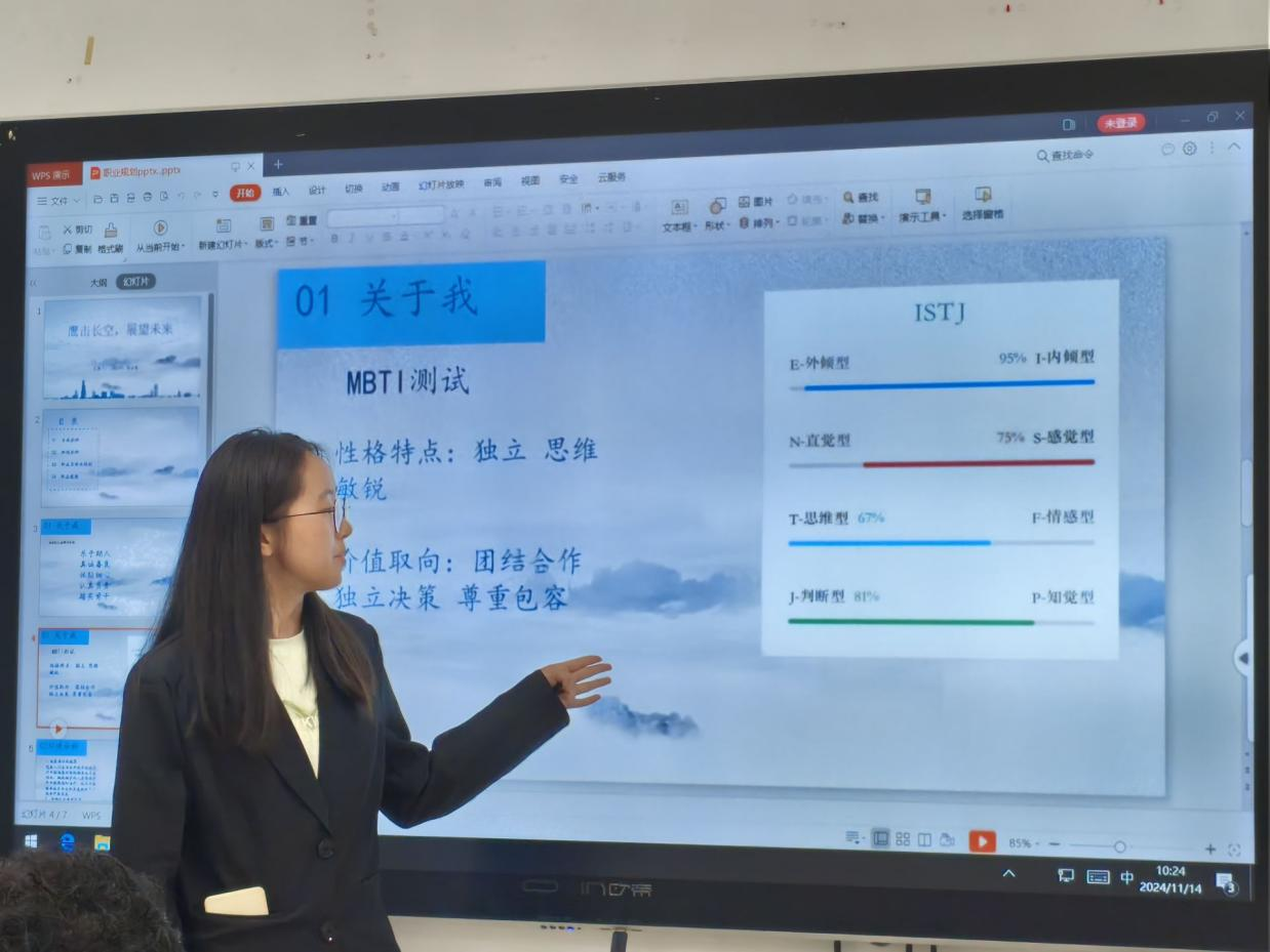 参赛选手们从职业定位、自我评估与认知、环境和职业分析、职业定位与计划实施、职业技能培养、职业评估调整、目标的设计与分解等方面进行讲解。他们不仅对自己的性格特点、兴趣爱好进行了深入剖析,还结合当前的社会环境和行业趋势,制定了切实可行的职业发展路径。PPT内容生动、主题鲜明、设计新颖,生动地展示了各自的职业梦想和未来规划。