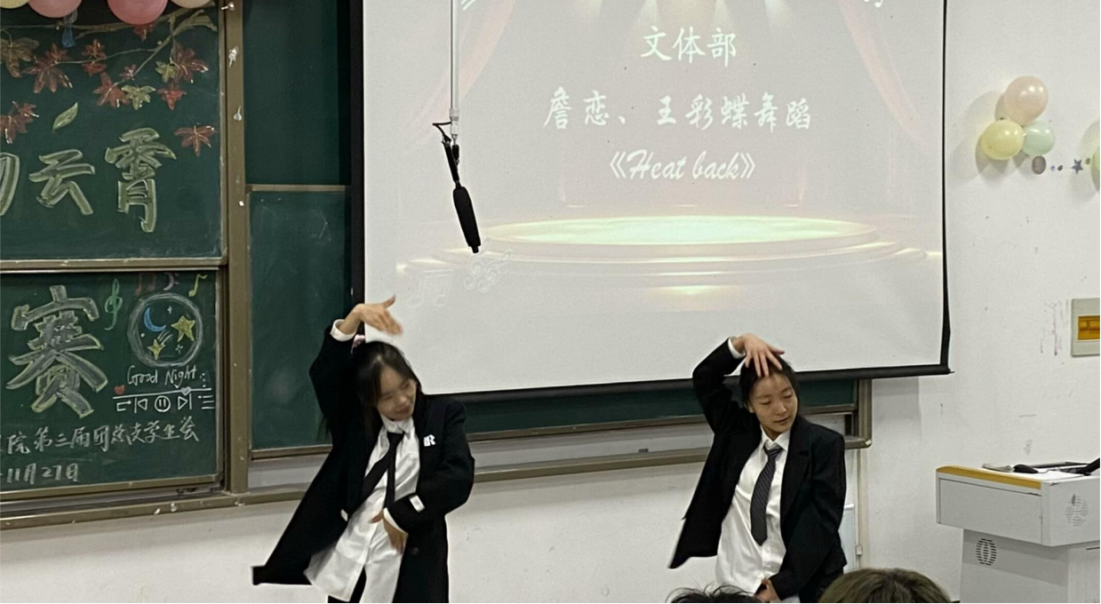 歌声从这里传递,音符从这里飘扬,青春从这里激荡,梦想从这里起航。一场充满青春活力与激情的音乐盛宴正式开始,校艺术团声乐部部长豆文怡带来的暖场歌曲《舍得》,文体部詹恋、王彩蝶学姐带来的舞蹈《Heat lack》,瞬间点燃了整个赛场的激情,气氛急剧升温至高潮。