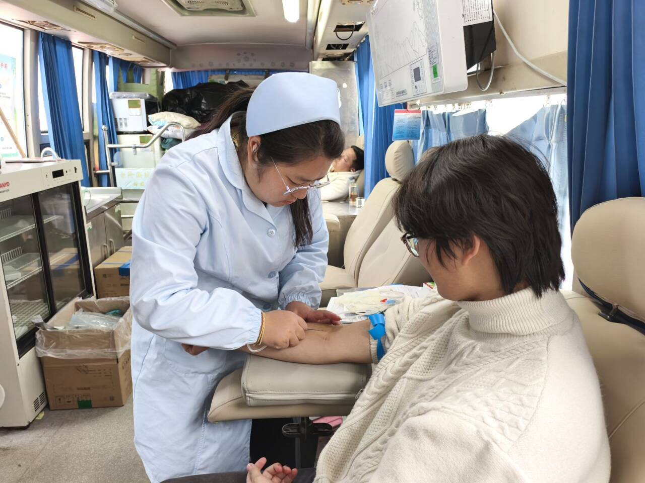 在无偿献血环节,均有专业医护人员进行操作,环境安全且无菌。并且,医护人员在献血过程中会时刻留意献血者的身体状况,同时向其耐心嘱咐后续注意事项。完成献血后,医护人员还会让献血者在献血车内观察十五分钟后确认无特殊情况后再让献血者离去。