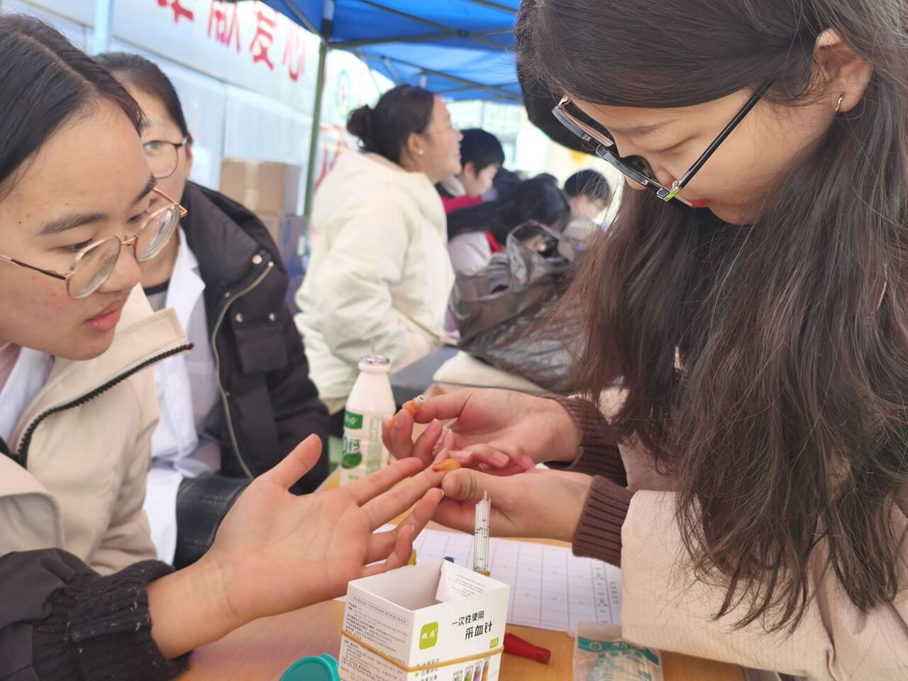 走进测血型的现场,健康医学院的志愿者们忙碌地穿梭在其中,微笑着为每一位前来献血的同学提供引导和帮助。他们耐心解答着各种疑问,让大家在轻松的氛围中缓解紧张的情绪。志愿者们用娴熟的手法、专业的检测试剂检测血型,并向同学们宣传讲解血型鉴定、无偿献血等相关知识,倡议同学们积极参与无偿献血活动,为社会公益事业贡献一份力量。