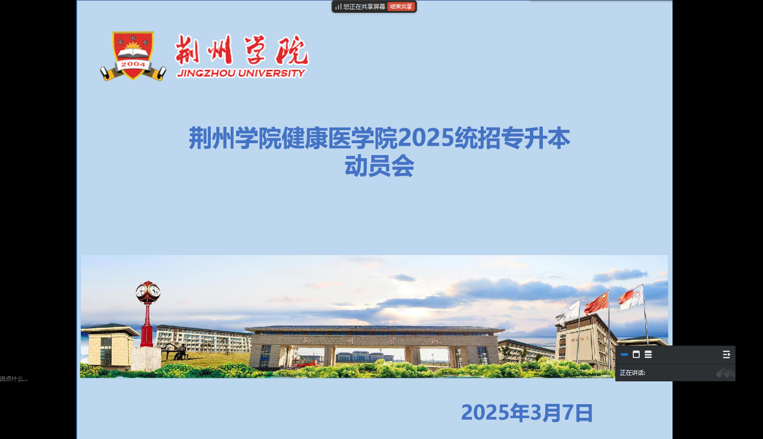 本网讯(通讯员 梁威怡)为进一步激发学生学习动力,明确升本目标,3月7日晚,健康医学院2025年统招专升本动员会通过直播形式召开,明确以"抢抓机遇·科学备考·规范报名"为主线,为学生指明升学方向、搭建升学指导平台。本次会议由团总支书记陈卓主持。