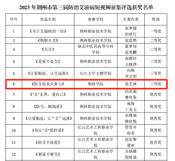 本网讯(通讯员 宋晓庆)12月1日上午,市防艾委组织开展了荆州市2023年“世界艾滋病日”宣传推进会暨第三届高校原创防“艾”宣传短视频征集活动颁奖典礼。参赛作品共77部,其中我校获奖作品共13部。张艺琳同学的参赛作品《防艾你我共参与》荣获三等奖,其余12部参赛作品均荣获优秀奖。WilliamHill中文官方网站荣获“优秀组织奖”。