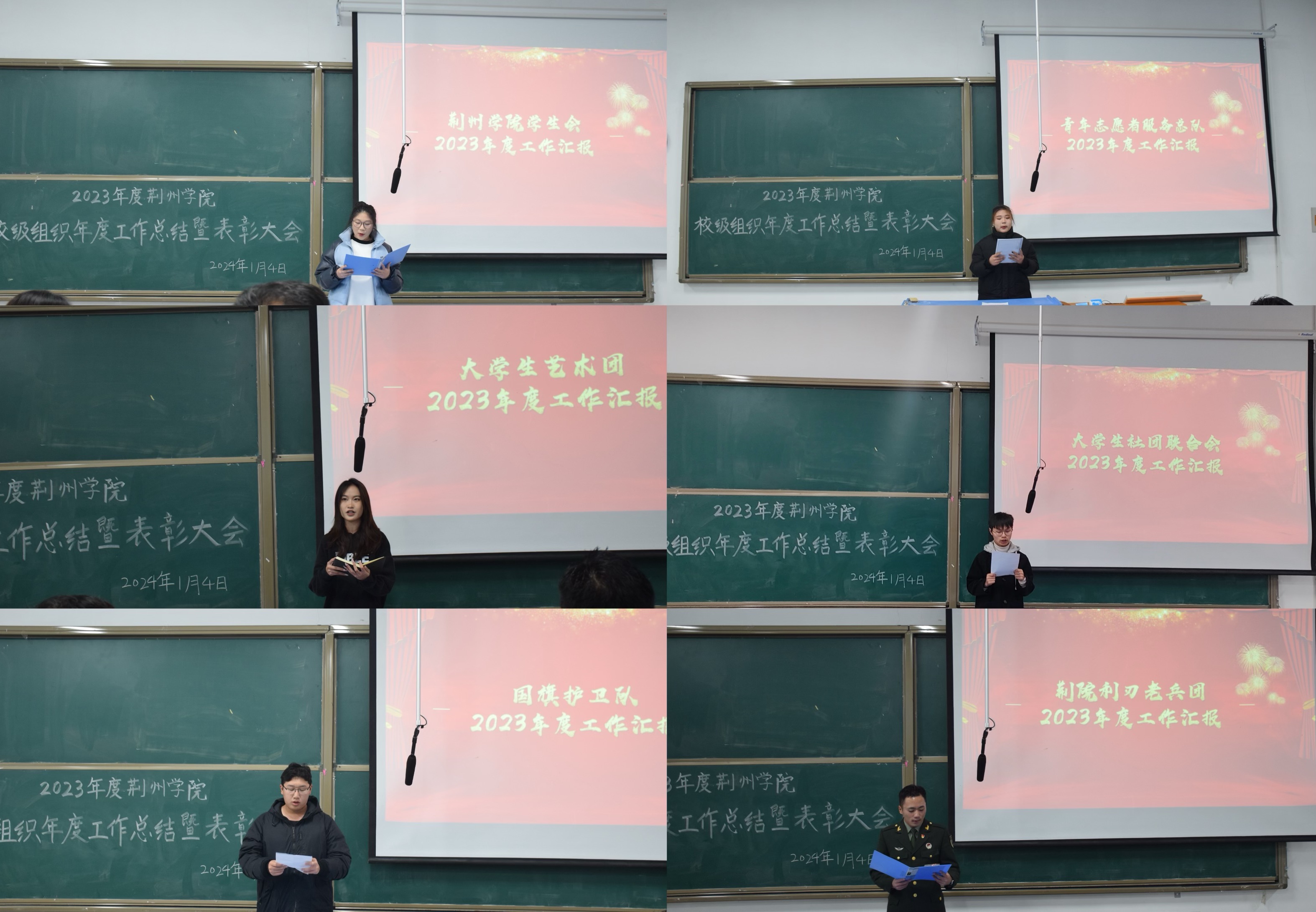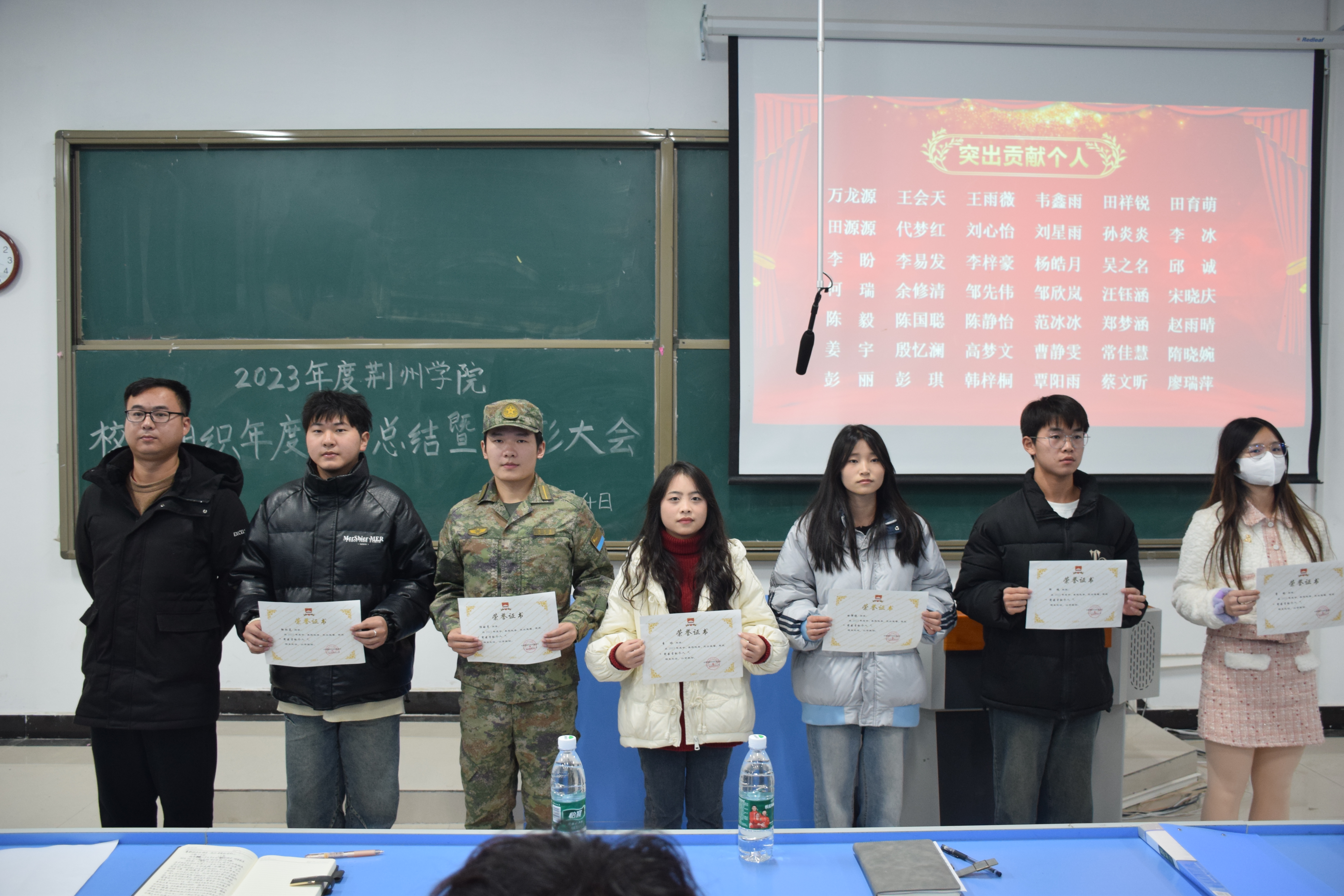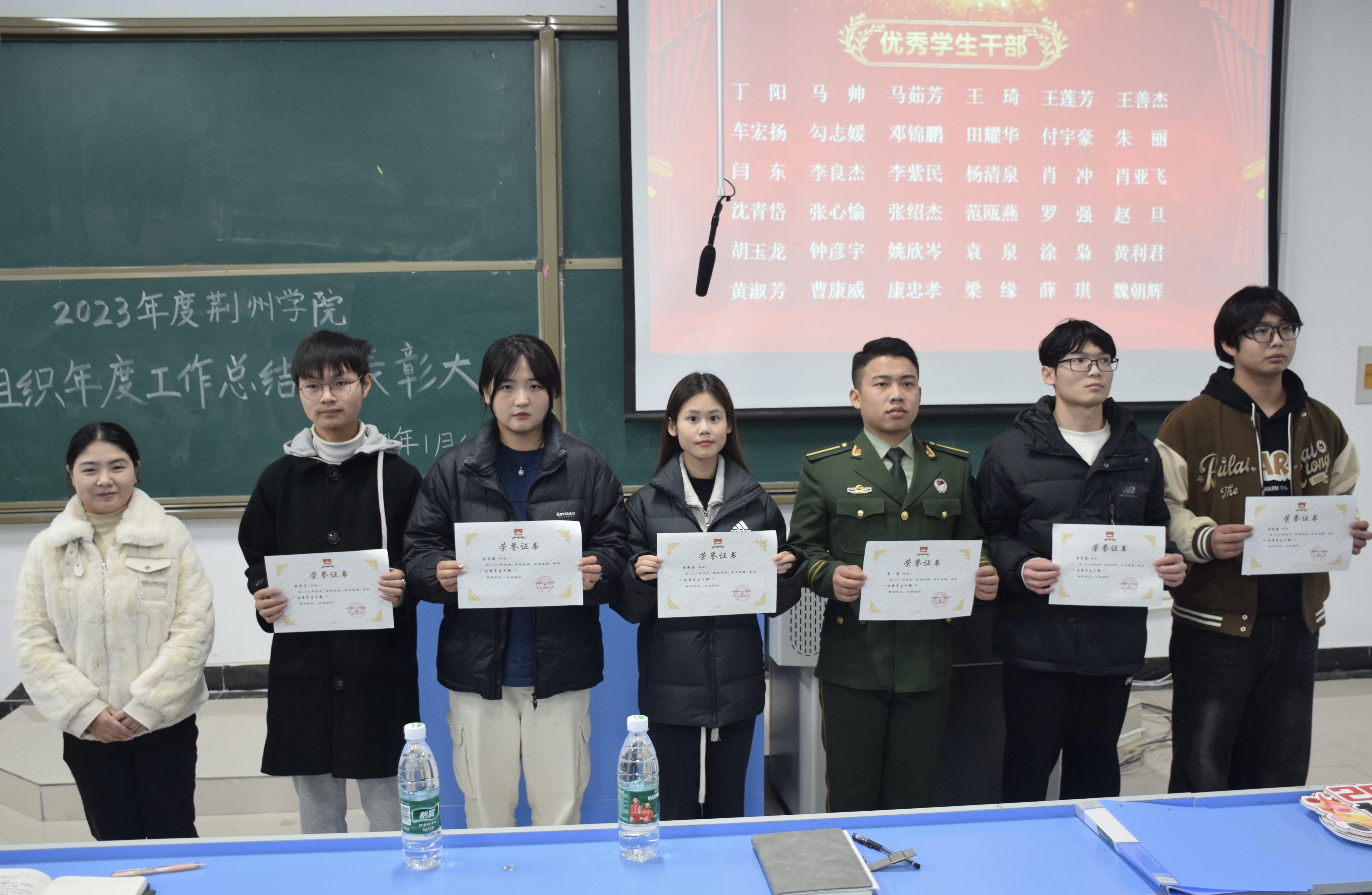 会上,各组织汇报人主要从调整组织结构、加强团队建设、部门工作内容以及特色亮点等方面将本年度的工作情况进行汇报,同时就下一阶段工作提出了具体的规划,明确了下一步工作目标,提出了工作中不足之处的改进措施。紧接着,由校团委陈仁圣老师宣读《关于表彰2023年度各校级学生组织先进个人的决定》,并颁发荣誉证书,对获得表彰的同学表示热烈的祝贺。其中受表彰的优秀学生干部共36人,突出贡献个人共42人,积极分子共97人。