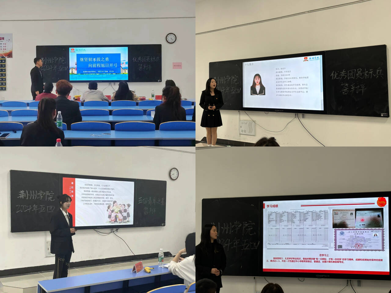 4月16日进行“优秀团员标兵”和“五四之星”的答辩。会上,大家分别从理想信念、学习成绩、志愿活动等方面介绍自己。生动诠释了“有理想、敢担当、能吃苦、肯奋斗”的新时代好青年的青春风貌。发挥榜样引领作用,展示了荆院学子良好的精神风貌。