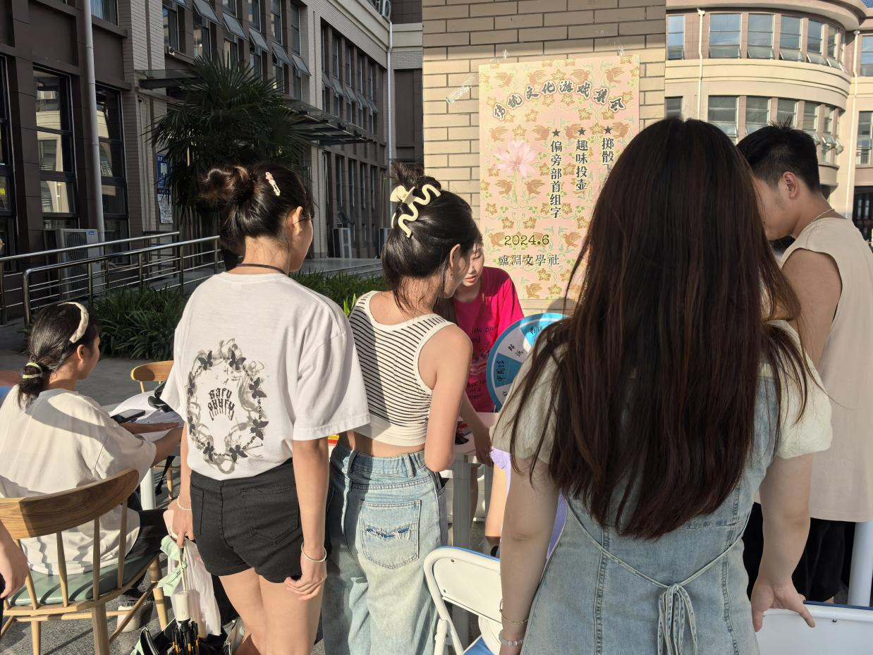 社团工作人员负责为参与的同学讲解规则,活动包含的游戏共三个:投壶游戏,加笔画组字以及掷骰子飞花令。参与人员根据指示成功的完成游戏后获得抽奖机会,奖品包括传统刺绣的杯垫、桌垫、文学相关的贴纸和明信片,以及极具代表性的中国结。