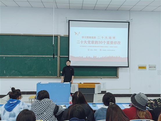 外国语学院学生党支部书记黄德虎围绕《中国共产党章程》基本概述、党的二十大修改党章的重大意义、党的二十大关于党章(修正案)决议、二十大党章的30个重要修改等4个方面进行细致讲解。整场分享鞭辟入里,深入浅出,既有思想高度,又有理论深度。有效地引导同学们进一步统一思想认识,强化责任担当。党章的一次次完善,彰显着中国共产党人推陈出新、与时俱进的创造精神。