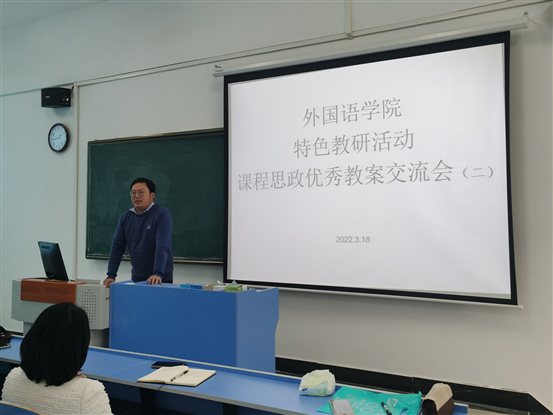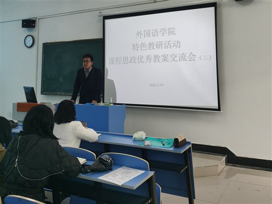 本网讯  为进一步推动外语教育教学改革,加强外语课程思政建设,外国语学院于3月18日下午在5402教室举办第二场特色教研室活动之课程思政优秀案例交流会,会议特邀马克思主义学院院长胡兆凌参与点评,会议由英语专业教研室主任曾晶主持,外国语学院全体教师参与观摩学习