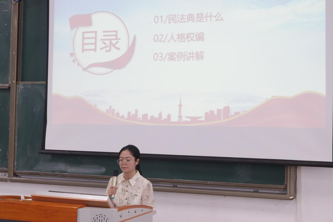 活动围绕民法典普及、反诈禁毒教育、健康安全防护三大主题展开。太湖港街道特聘律师王玉梅女士首先以《民法典与公民权益保护》为题,结合生活案例,深入解读民法典的核心内容,强调其作为“社会生活的百科全书”的重要意义,并现场发放宣传手册,激发师生学法用法的热情。