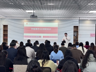 随后,学务部学籍科王俊博老师围绕学籍事务管理进行了系统培训。王老师以《精进业务,规范管理:学籍事务全流程培训》为题,阐述了学籍学历管理的重要性,强调了“管入口、管过程、管出口”的全链条规范管理理念。他结合《普通高等学校学生管理规定》(教育部41号令)等政策依据,对新生入学资格复查、学籍电子注册、学年注册、学历注册以及在校生学籍异动等关键环节的操作规范与注意事项进行了细致解读。此外,王老师还就学生证管理、学生档案管理等日常事务流程进行了说明,提醒辅导员们务必确保各项学籍信息的真实性、准确性与及时性。最后,他就“到梦空间”第二课堂成绩单系统的操作实务进行了讲解与演示,助力辅导员更好地利用数字化平台管理和丰富学生的课外实践活动。