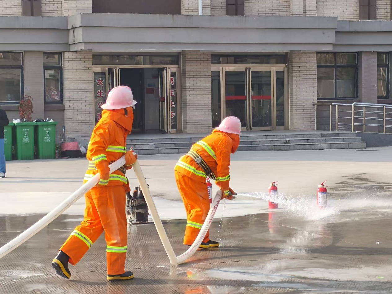 与此同时,学校消防站的消防员们迅速响应,他们身穿消防服,携带专业灭火器材,第一时间赶赴“火灾现场”。在消防员的熟练操作下,火势迅速得到了控制并最终被扑灭。整个灭火过程紧张而有序,充分展示了消防员们的专业素养和应急能力。