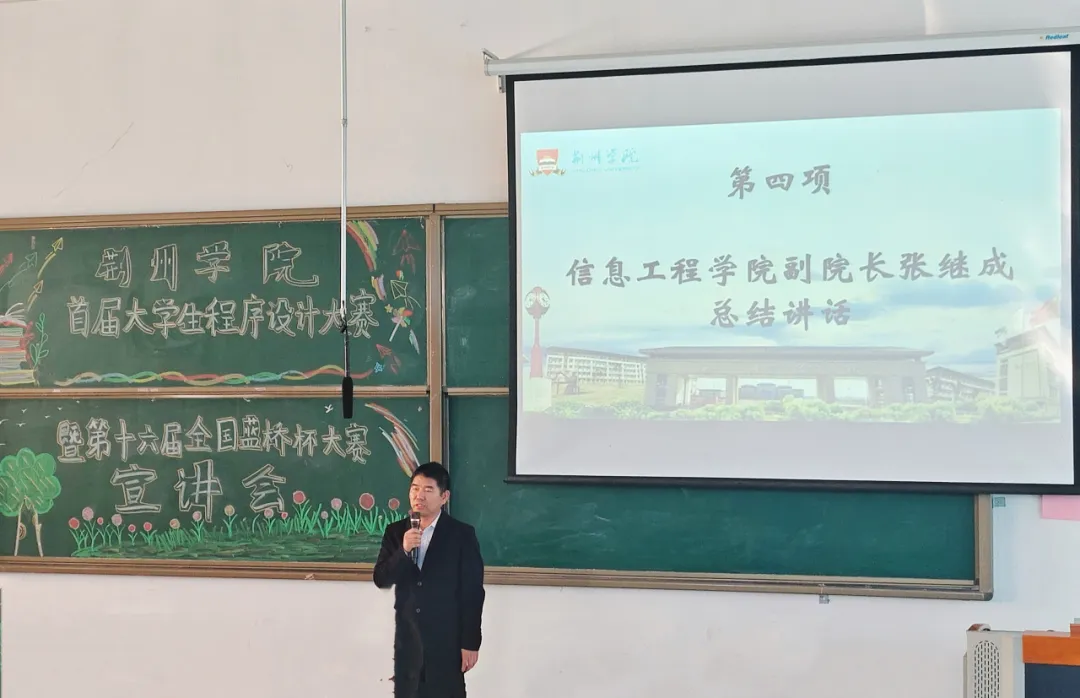 最后,信息工程学院副院长张继成对宣讲会进行总结。他回顾了信息工程学院历年来的大赛辉煌成就,强调学院始终秉持“以赛促学、以赛促教、以赛促练、以赛促就”的教学理念,致力于培养学生的实践能力和创新精神。在各类大赛中,学院学子屡获殊荣,这背后离不开学院强大的竞赛指导老师团队和丰富的指导经验。