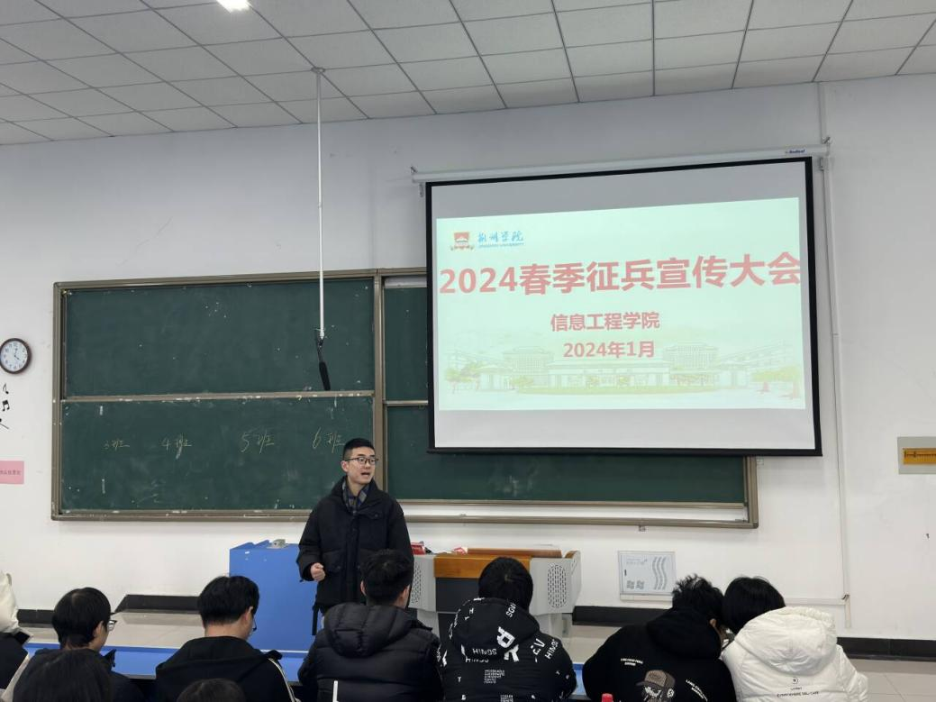 国防强则国家胜,军队勇则民族兴。为响应国家征兵政策,扎实做好征兵工作,积极动员大学生踊跃报名参军,信息工程学院于1月3日在6505教室开展了2024年春季征兵宣传大会,辅导员牛家鑫、罗艳丽、薛楚雄分别开展了入伍宣传大会。