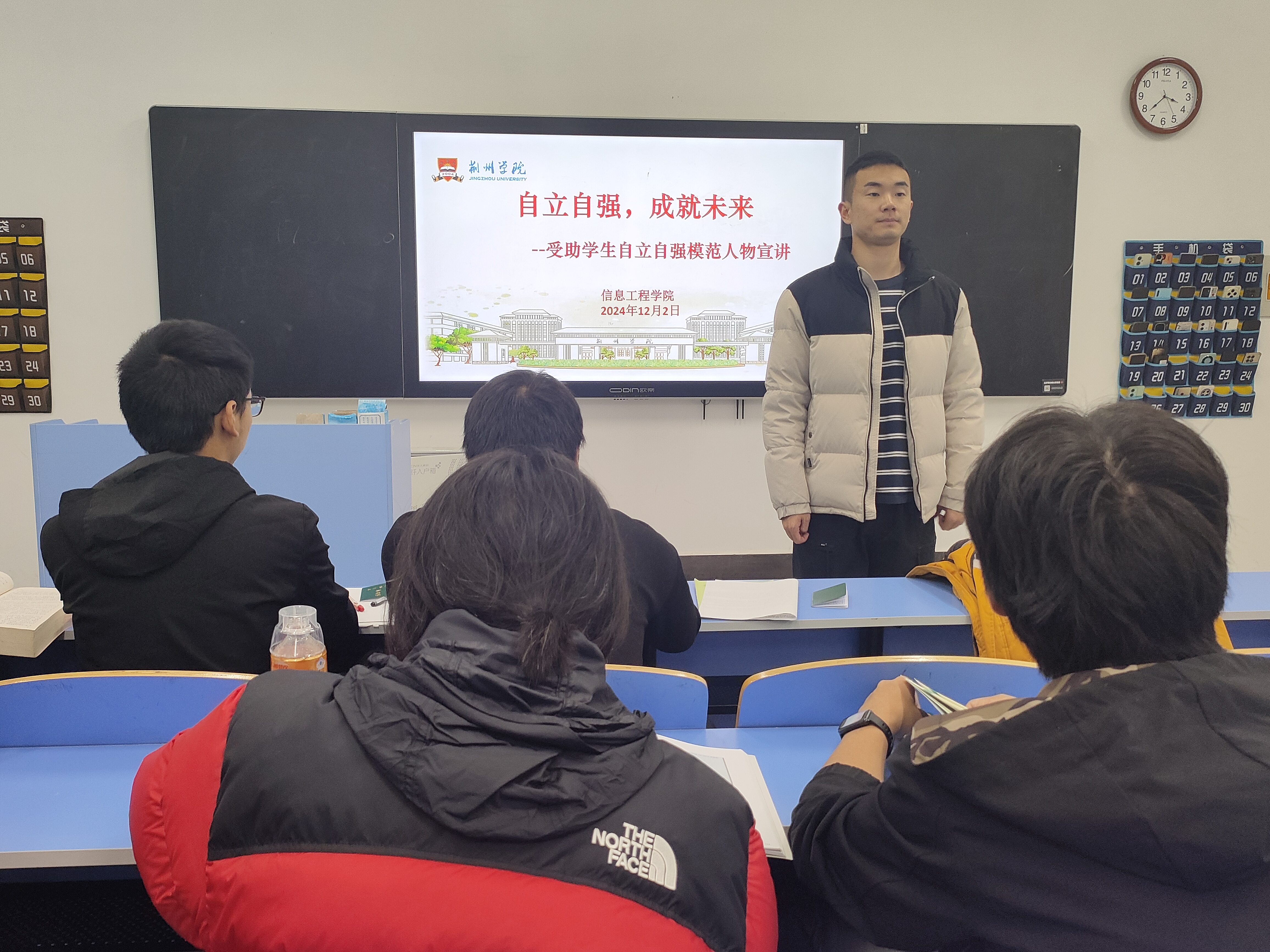 为了进一步加强学生感恩教育,树立学习榜样,信息工程学院于2024年11月27日成功举办了以“自立自强,成就未来”为主题的班会活动。班会主讲人为信息工程学院辅导员薛楚雄老师,参会人员为信息工程学院辅导员和受助学生。此次班会旨在通过分享励志故事、探讨感恩意义,激励广大学生珍惜资助机会,努力学习,以实际行动回馈社会。