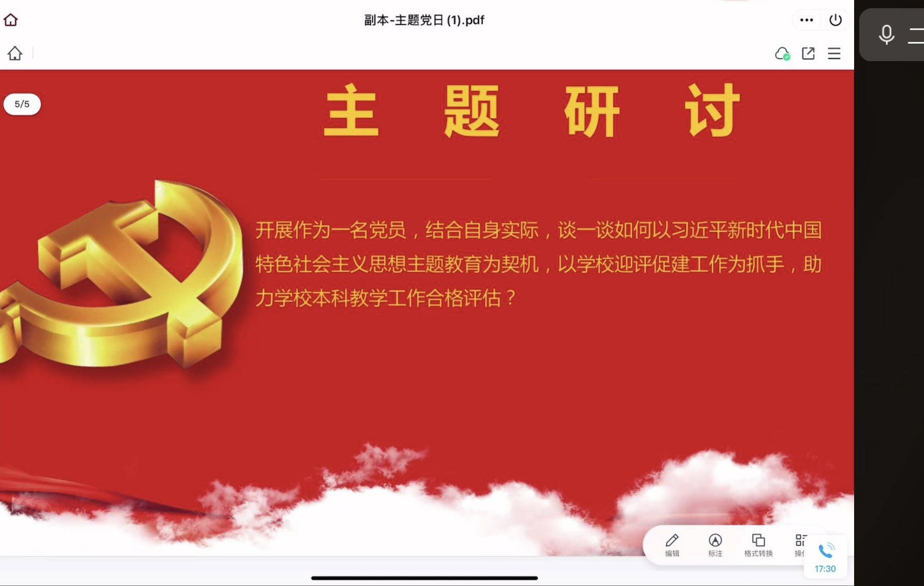 随后,全体党员同志重温入党誓词,开展研讨作为一名党员,结合自身实际,如何以学习贯彻习近平新时代中国特色社会主义思想主题教育为契机,以学校迎评促建工作为抓手,助力学校本科教学工作合格评估;各位党员同志展开了热烈讨论,积极分享,各抒己见。