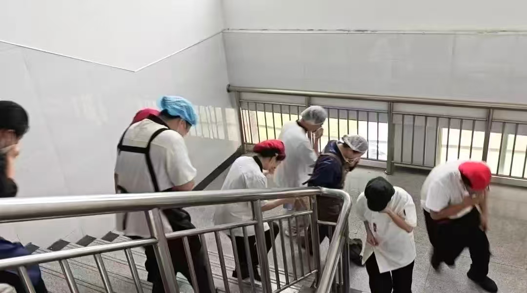 本次演练的重头戏——安全疏散逃生科目正式开始。此时正值模拟就餐高峰,食堂内人员密集。听到警报后,各区域安全员立即到位,沉着冷静地引导师生员工按照食堂内清晰的疏散指示标志,弯腰低姿、用湿毛巾捂住口鼻,迅速向最近的安全出口撤离。整个疏散过程紧张而不慌乱。参与演练的人在工作人员的指引下,行动迅速,配合默契,所有人员便全部安全撤离至食堂外的指定集结点。随后,各班组清点人数,确保无一人遗漏。这场高度模拟真实火场环境的疏散演练,有效检验了食堂应急预案的可行性和工作人员的组织协调能力。