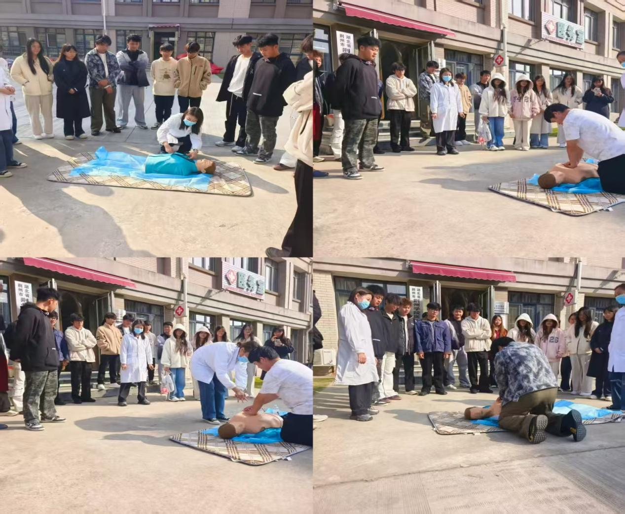 现场参训人员在医务室前的空地上认真参与实操演练:有的在医务人员指导下练习胸外按压动作,有的在模拟人旁学习操作要点,现场学习氛围浓厚。