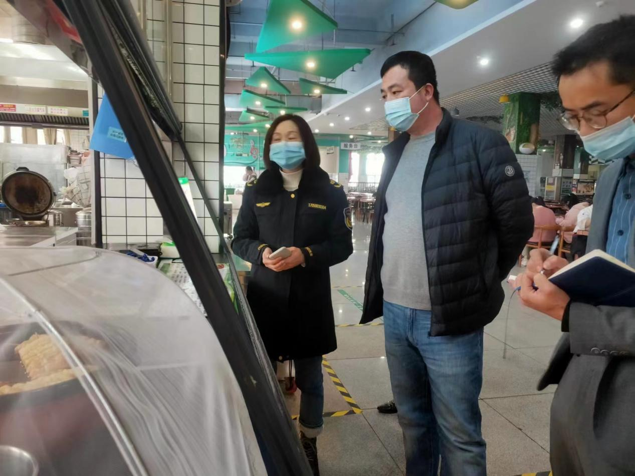 王主任一行先后走访查看了我校一餐厅、双创餐厅、超市等场所的环境卫生、商品价格、饭菜质量、食材贮存、从业人员健康管理、食堂安全的规范管理等情况,并就“互联网+明厨亮灶”和“日管控、周排查、月调度”工作机制的落实情况与学校进行了沟通交流。