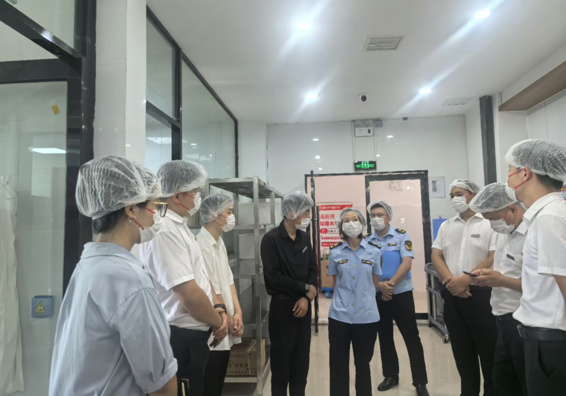 本网讯9月10日上午,荆州高新区市场监督管理局王红梅主任一行到我校检查指导食品安全工作,膳食服务中心负责人雷云枫、餐厅监管人员和餐饮公司现场经理陪同。